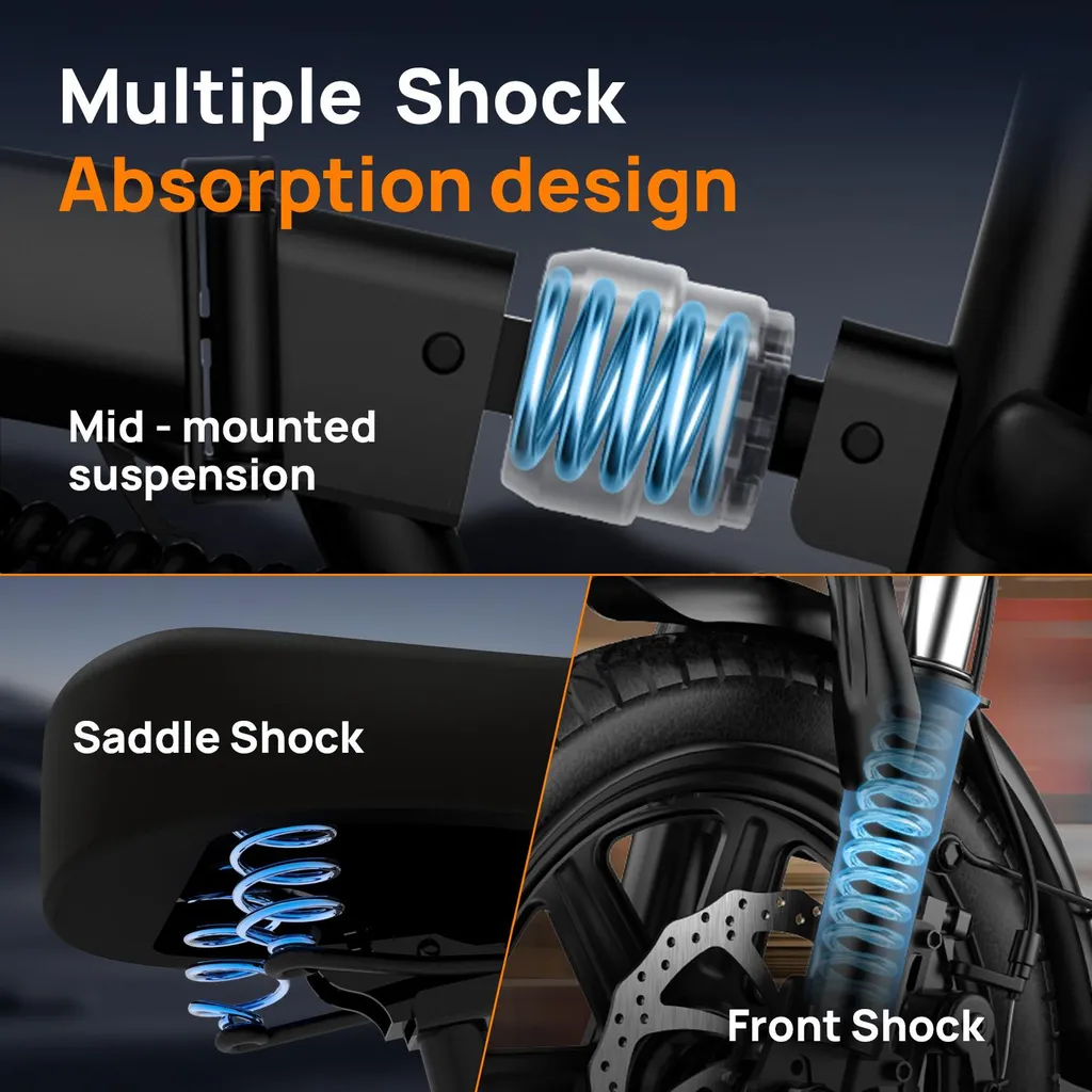 Komfort & Sicherheit mit Scheibenbremsen & Federung: Die 14×2.125 Zoll Reifen bieten optimale Kontrolle in der Stadt. Die vordere Federgabel sorgt für angenehmen Fahrkomfort. Belastbar bis 120 kg – eines der stärksten elektrofahrräder seiner Klasse.