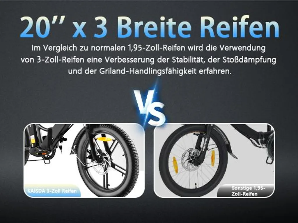 【All-Terrain-Reifen für maximale Flexibilität】 Die 20 Zoll Fat Tire des E-Bikes sind speziell für Schnee, Strand und Stadt entwickelt. Die breiten All-Terrain-Reifen bieten extremen Grip auf rutschigem Untergrund und absorbieren Stöße perfekt – ob auf unebenen Waldwegen, verschneiten Straßen oder sandigen Küsten. Mit einer 150KG Belastung ist das E-Bike auch für schwere Lasten geeignet.