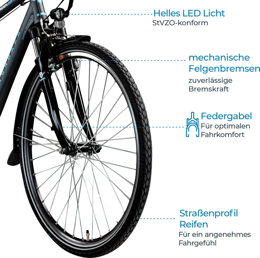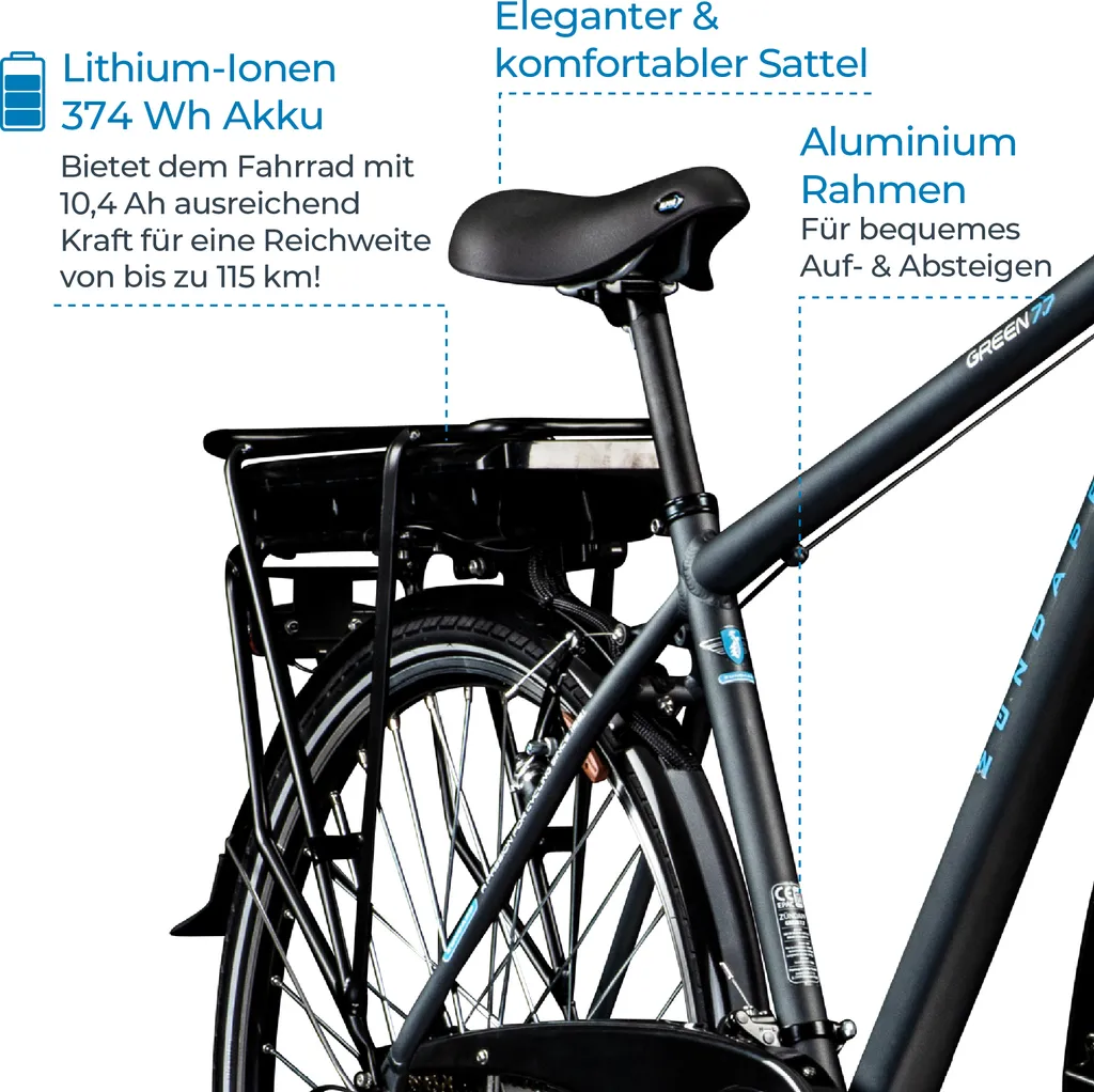 Insgesamt fördert das Bike eine komfortorientierte Sitzposition auf dem bequemen Fahrrad Sattel, durch die lange Touren ermüdungsfrei gefahren werden können.
