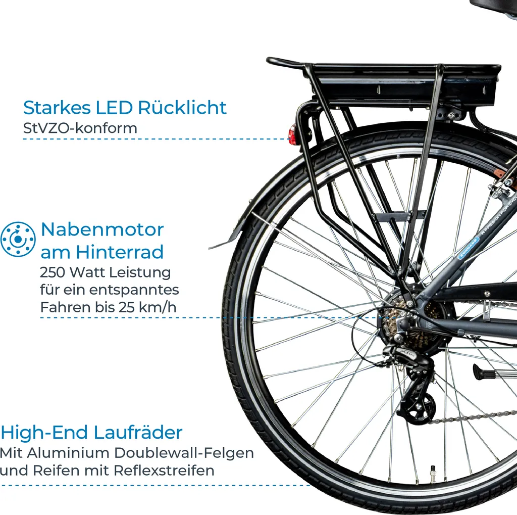 Als Bike für den Alltag ist das Elektrofahrrad bereits voll ausgestattet: Neben der verkehrssicheren Beleuchtung gemäß StVZO gehören zum Lieferumfang auch Schutzbleche, Kettenschutz, Gepäckträger und Seitenständer.