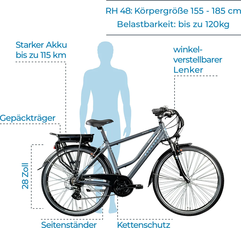 Wir empfehlen das Pedelec für Personen mit einer Körpergröße zwischen 155 und 185 cm. Nach einer kurzen Endmontage des Lenkers sowie einer Prüfung von Schrauben und Schaltung sowie Bremsen können Sie direkt losfahren.