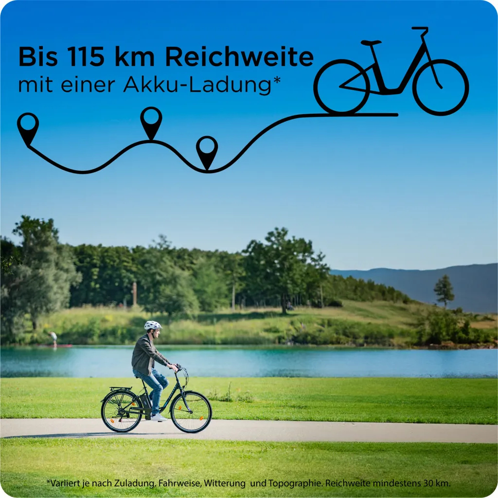Der Ananda Radnabenmotor am Hinterrad sorgt mit 250 W Leistung für kräftigen Vortrieb bei natürlichem Pedaliergefühl am Elektrofahrrad. Die drei Fahrmodi werden am LED-Display ausgewählt, der am Sitzrohr montierte Akku bietet mit 360 Wh Kapazität eine Reichweite zwischen 30 und 115 km. Da neben dem Gesamtgewicht auch das gewählte Unterstützungslevel, die Geländebedingungen und Wetterverhältnisse wie beispielsweise Gegenwind Einfluss nehmen, ist eine exakte Angabe der Reichweite von E-Bike Akkus kaum möglich. Unsere Angaben sollen daher als Richtwert verstanden werden.
